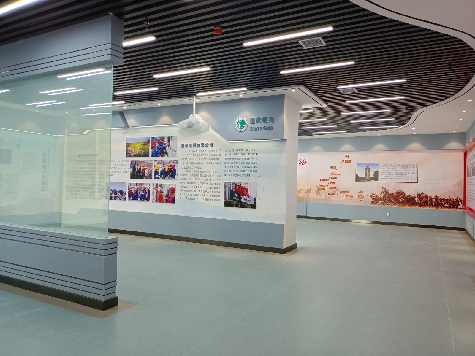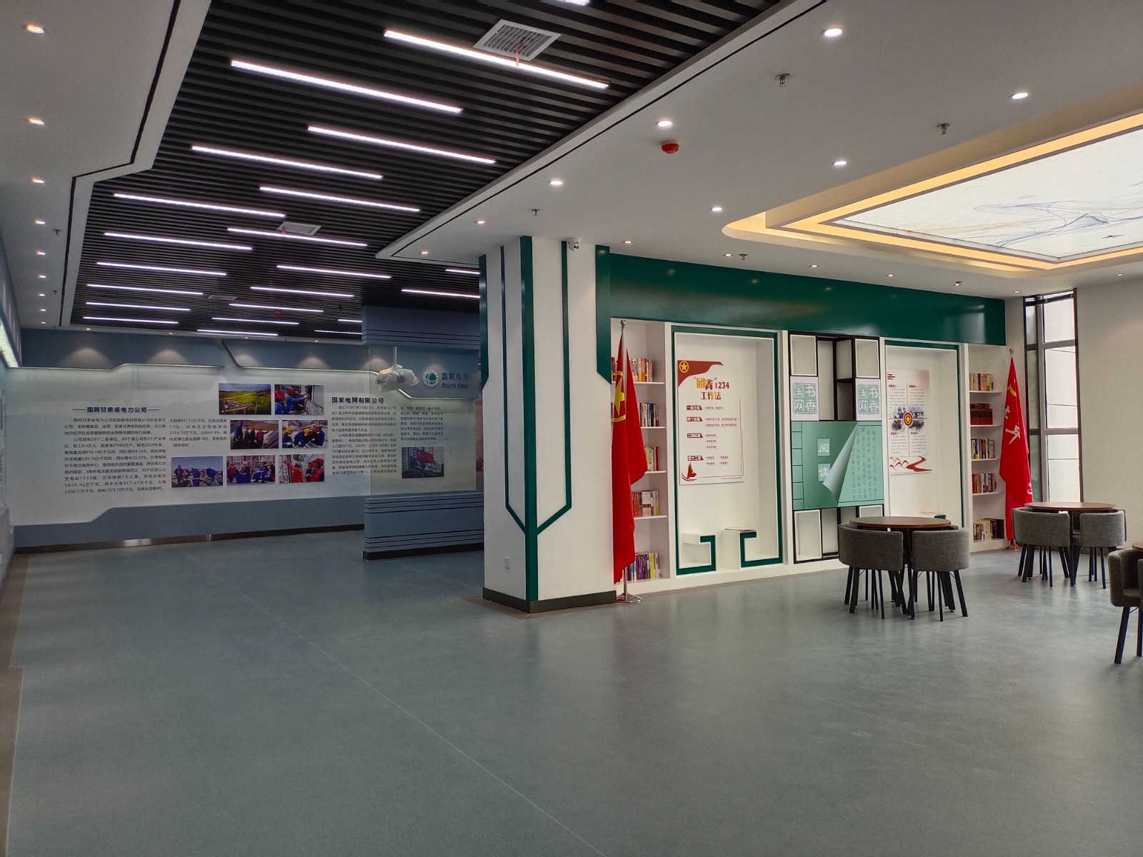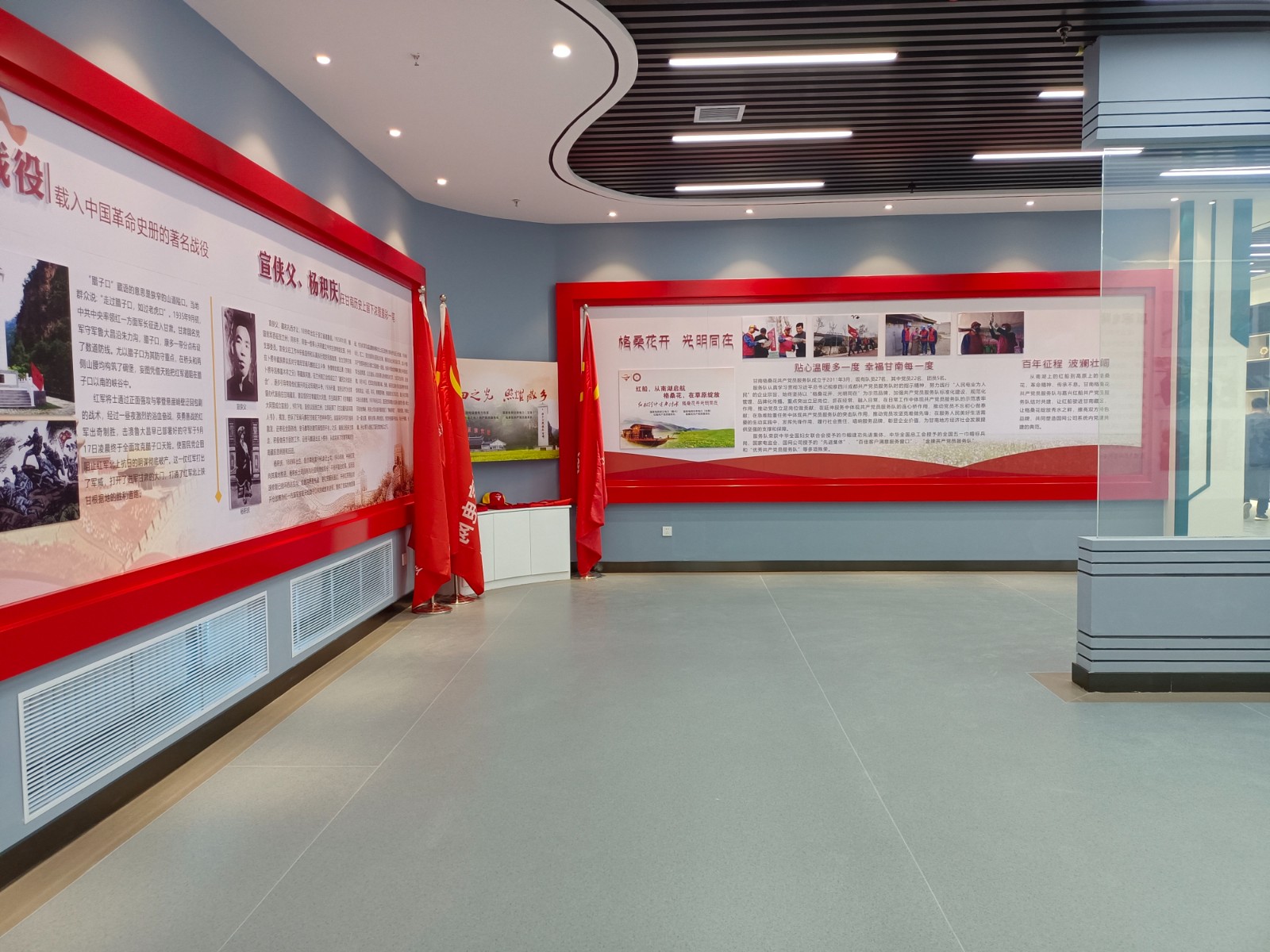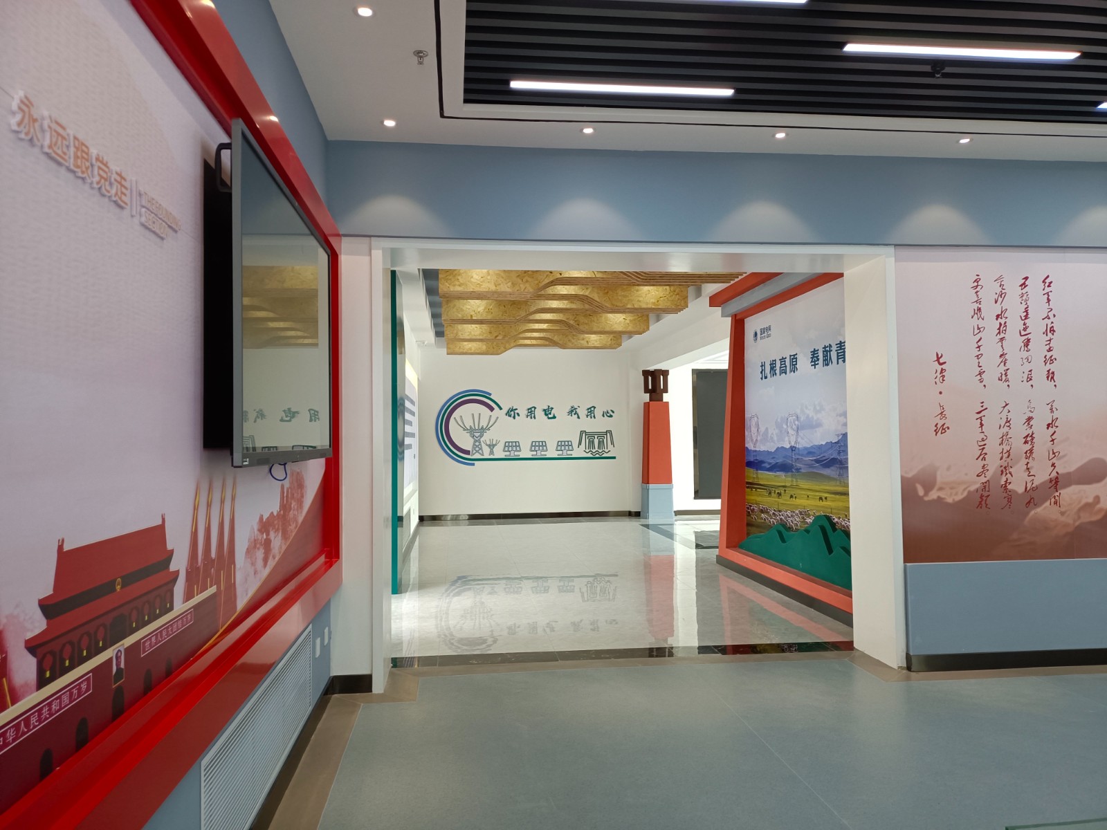 基地一樓為精神文化宣教區(qū)域,共分序言、初心引領(lǐng)、黨旗引頒、紅色甘南黨史教育、電網(wǎng)企業(yè)文化、甘南電力發(fā)展展示、紅色經(jīng)典智慧閱讀等區(qū)域。