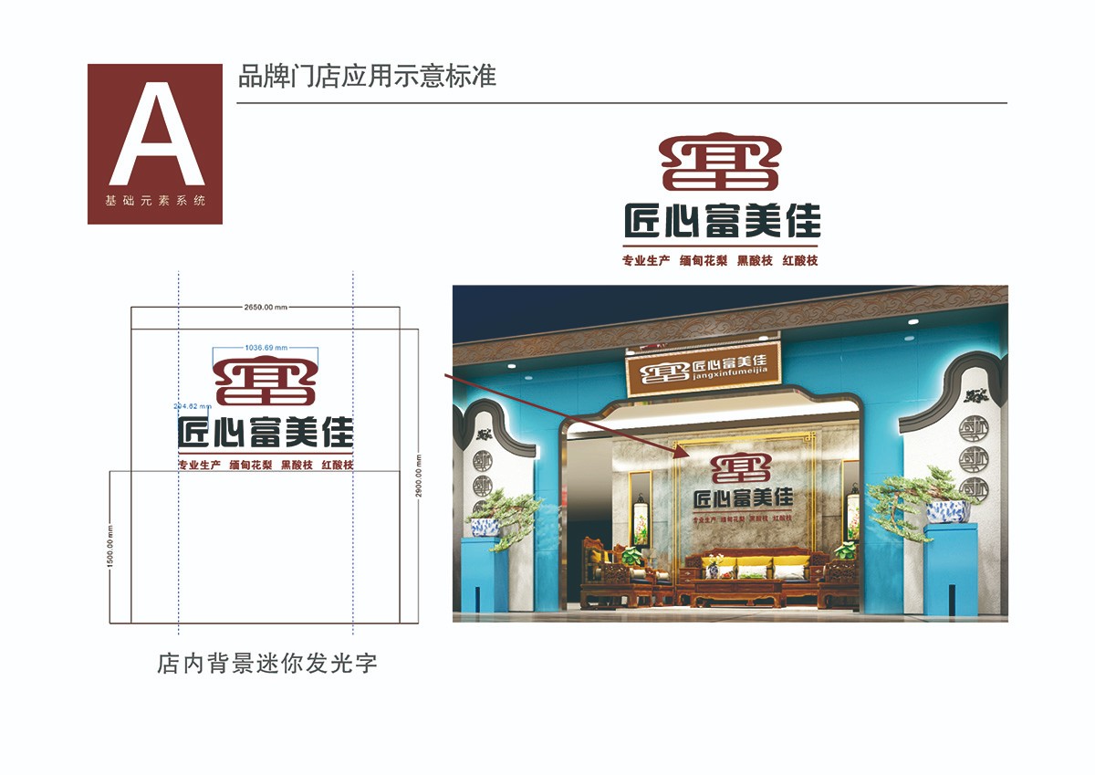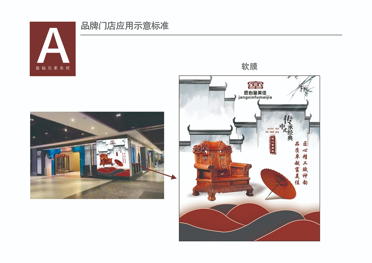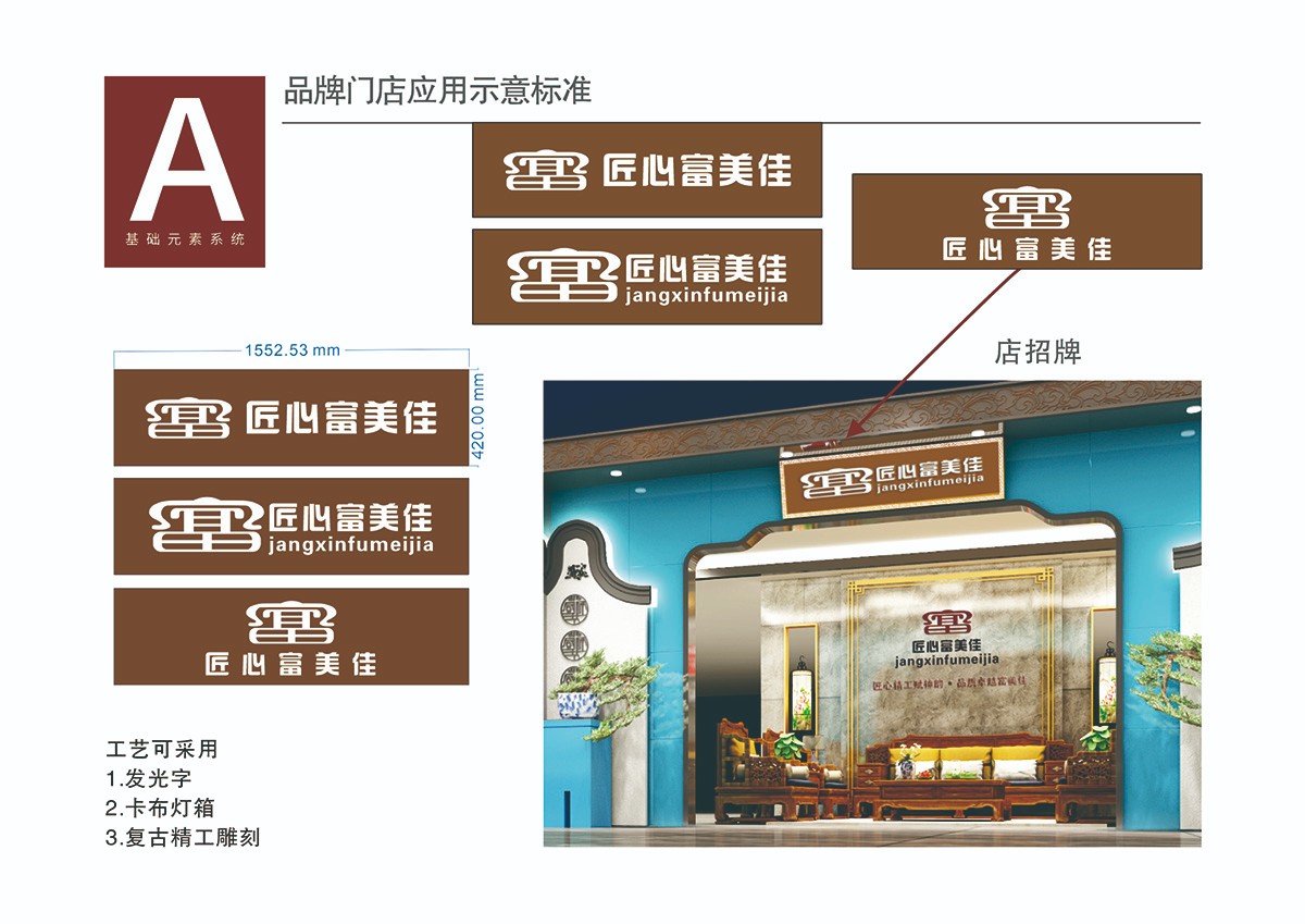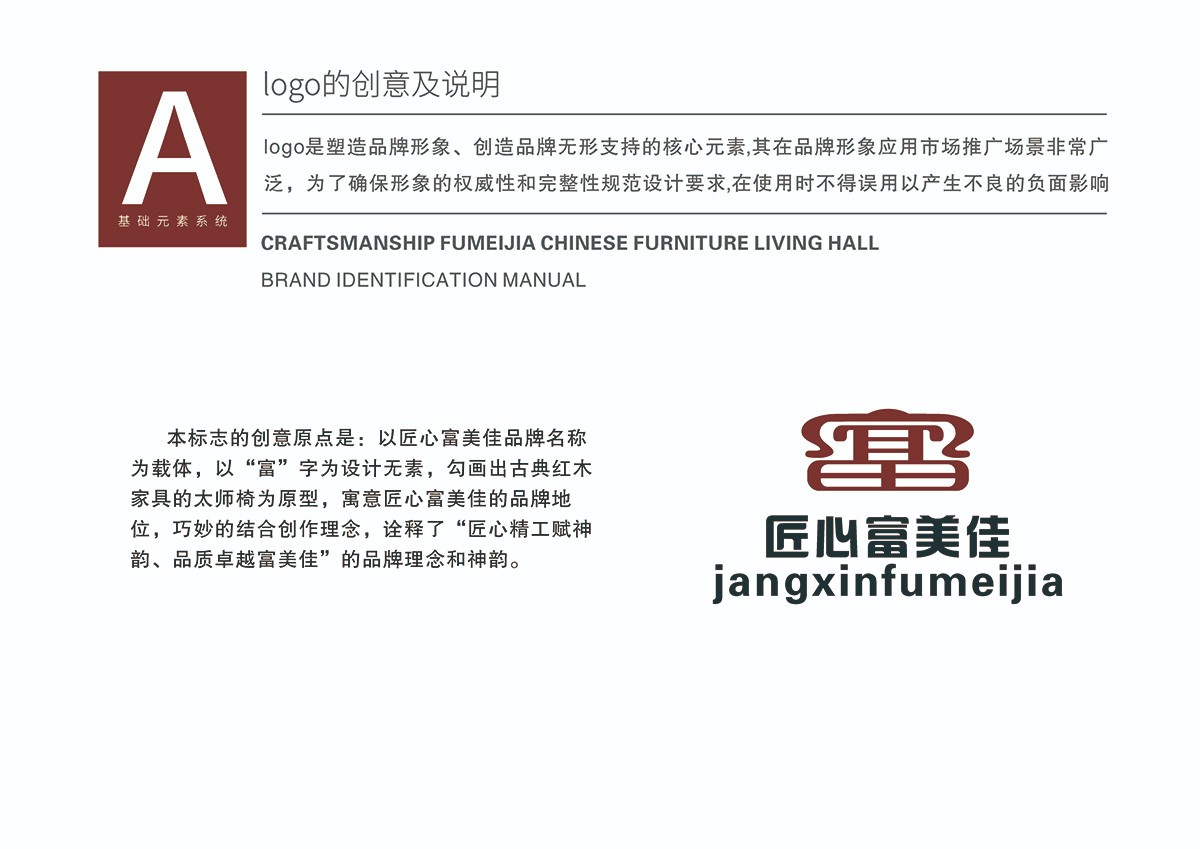 本標(biāo)志的創(chuàng)意原點(diǎn)是:以匠心富美佳品牌名稱為載體,以“富”字為設(shè)計(jì)無素,勾畫出古典紅木家具的太師椅為原型,寓意匠心富美佳的品牌地位,巧妙的結(jié)合創(chuàng)作理念,詮釋了“匠心精工賦神韻、品質(zhì)卓越富美佳”的品牌理念和神韻。