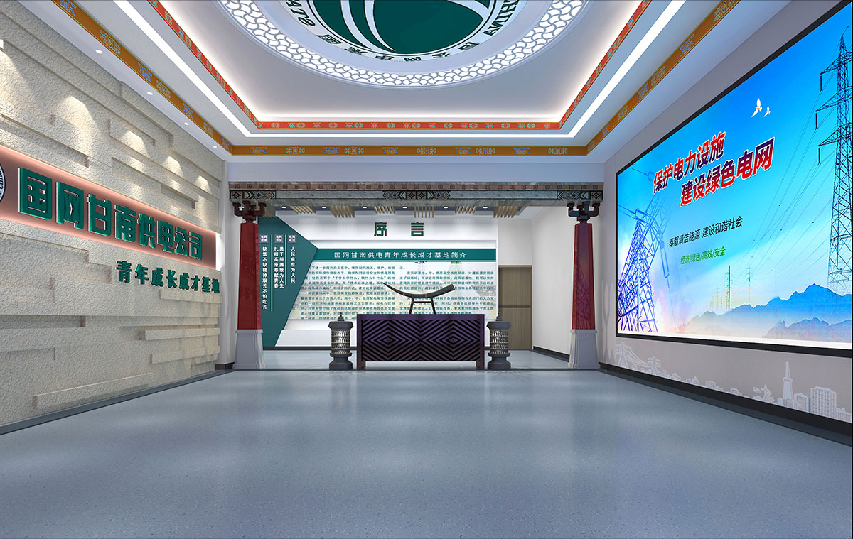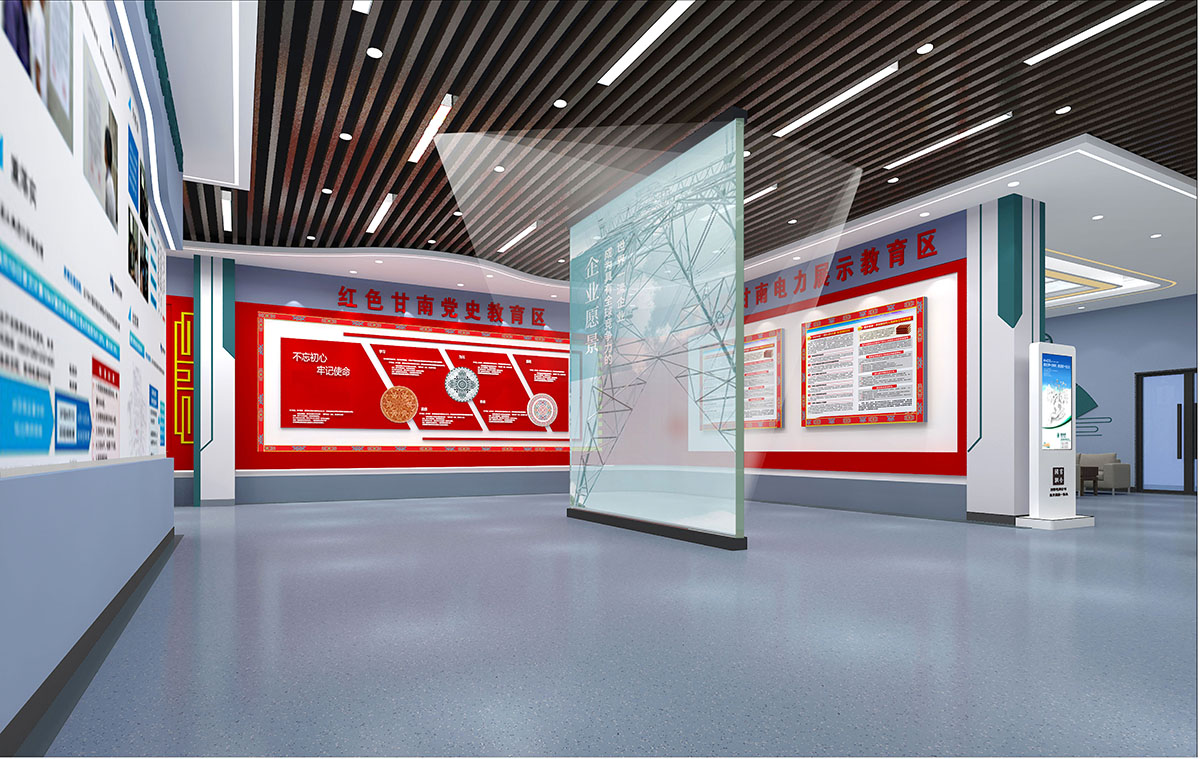 基地一樓為精神文化宣教區(qū)域,共分序言、初心引領(lǐng)、黨旗引頒、紅色甘南黨史教育、電網(wǎng)企業(yè)文化、甘南電力發(fā)展展示、紅色經(jīng)典智慧閱讀等區(qū)域。